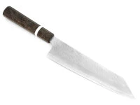 -Wert, Messgröße für die Härte des Stahls, liegt bei 61. VG-10 ist ein Edelstahl und enthält im Unterschied zu den Kohlenstoffstählen Aogami oder Shirogami ca. 15% Chrom. Die Ummantelung besteht aus 16 Lagen härterem und 18 etwas weicherem Nickel Damast. So dass Härte, Schärfe und die sinnvolle Elastizität in einem hervorragenden Verhältnis zueinanderstehen. Finish: Optisch wird die Klinge einerseits durch die Damast Lagen, andererseits – im oberen Bereich – durch das Hammering dominiert. Bevor die Klinge gehämmert wird, bearbeitet Yoshimi die Klingen-Oberfläche mit einem besonders feinen Schliff. In Test hat sich herausgestellt, dass der eckige, besondere Stil des Hammerings den Antihaft-Effekt für Schnittgut sehr gut unterstützt. Griff: Der Griff dieser Messer ist aus hochwertigem, seltenem