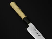 Damastmesser Sashimi aus Ginsan Silver-3 Stahl und 33 Lagen Damaststahl. Hergestellt von Meister Suogo Yamatsuka, der bekannt dafür ist, außergewöhnliche, japanische Messer zu produzieren. Er hat sich auf die Verarbeitung von Ginsan Silver-3 Stahl spezialisiert. Die Messer sind korrosionsbeständig und haben ein extrem hohes Schärfepotenzial. Das Messer ist beidseitig geschliffen, hat einen Vollholz Griff aus Magnolie und eine Zwinge aus Büffelhorn.