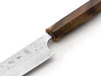 von Kanehiro Hamono, geschmiedet von Yoshimi Kato. Ein außergewöhnliches Damastmesser mit gehämmerter Damast Klinge und Ergonomie-Griff aus dem seltenen white ebony. Der Klingen-Kern besteht aus VG-10 Stahl, der mit insgesamt 34 Lagen Damast Stahl ummantelt ist. Dabei setzt Yoshimi Kato zwei unterschiedliche Sorten von Damast Stahl ein, um das optimale Härte-Flexibilität Verhältnis zu erreichen. Das ungewöhnliche Hammering der Klinge im oberen Teil ist nicht nur ein auffallendes Design-Merkmal, es hat bei Tests auch sehr gute Anti-Haft Effekte gezeigt. Die Messerform