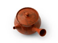 Mokake Shu zeigt besonders eindrucksvoll, dass Gyokko die Mokake-Technik auf hohem Niveau beherrscht. Mit Algen kreiert er die spannende Verzierung. Zwei Brennvorgänge, wohldosiert, sind nötig, damit die Teekanne mit dem Muster zur Einheit wird. Meister Gyokko aus Tokoname fertigt die Teekanne mit integriertem Keramiksieb von Hand auf der Töpferscheibe. Die handgefertigte