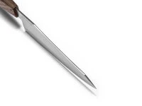 , auch Messer der drei Tugenden genannt, ist das typische Allzweckmesser, das man immer zur Hand haben sollte. Für Fleisch, Fisch und Gemüse. An diesem Messer ist nichts gewöhnlich: Weder die Form der Klinge, die Form des schönen Griffs, oder der verwendete Stahl. Jikko hat die Klingen der Serie Kuin oku aus SG2, einem modernen, pulvermetallurgischen Stahl gefertigt. Die Schnittleistung von SG2 oder SGPS ist wie auch die Härte des Stahls sehr hoch, bei der Rostbeständigkeit erreicht der Stahl einen Spitzenwert. Schärfe und Schneidhaltigkeit erreichen annähernd die Werte von Aogami Super. Schön und ergonomisch ist der Griff aus dunkler Eiche. Mit ihm hat man die für ein