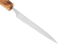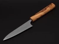 Messer von Yoshimi Kato vereint Schönheit und Funktionalität. Der Griff aus italienischem Olivenholz, gewachst, achteckig geformt, liegt perfekt in der Hand. Sofort erwacht der Wunsch, die schöne, gehämmerte Klinge ihrem eigentlichen Zweck zuzuführen. Die ca. 120 mm lange Klinge des handlichen Messers wurde aus SG2 Stahl gefertigt. Der renommierte Stahlhersteller Takefu Special Steel bezeichnet den Stahl als Super Gold 2 (SPG2). Es ist ein pulvermetallurgischer, rostfreier Stahl mit einigen Besonderheiten. Messer-Schmiede und Messer-Liebhaber schätzen besonders die homogene, feine Struktur, den hohen Härtegrad von 63