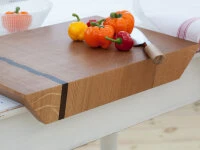 Besonders praktisch ist die Möglichkeit, die Schneidplatte aufzustellen. Dadurch entsteht mehr Platz auf der Arbeitsfläche und das Schneidebrett wird besser belüftet, was den Trocknungsprozess positiv beeinflusst. Auch die Reinigung des Bretts wird dadurch erleichtert, da es von beiden Seiten leichter zugänglich ist.