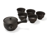 hat ein integriertes, handgefertigtes Keramiksieb. Das Teeservice wurde komplett von Meister Gyokko aus Tokoname gefertigt. Wie alle Produkte von Gyokko wurde auch diese Teekanne von Hand auf der Töpferscheibe gefertigt. Gyokko ist einer der bekanntesten Meister dieser Kunst und verwendet ausschließlich natürlichen, mineralstoffreichen Ton aus Tokoname, der bei hohen Temperaturen gebrannt werden kann. Seine feinen Muster sind oft Vorlage für Kopierversuche, was in Japan als großes Kompliment gilt. Die Teekannen aus Tokoname begeistern Kenner mit ihrer unaufdringlichen Schönheit und der Geschmacksverbesserung für den Grünen Tee, die diesen Kannen eigen ist. Die schöne Teekanne wiegt ca. 310 Gramm und fasst ungefähr 300 ml. Die schwarzen Teeschalen Sendan Kuro von Meister Gyokko fassen ca. 100 ml.